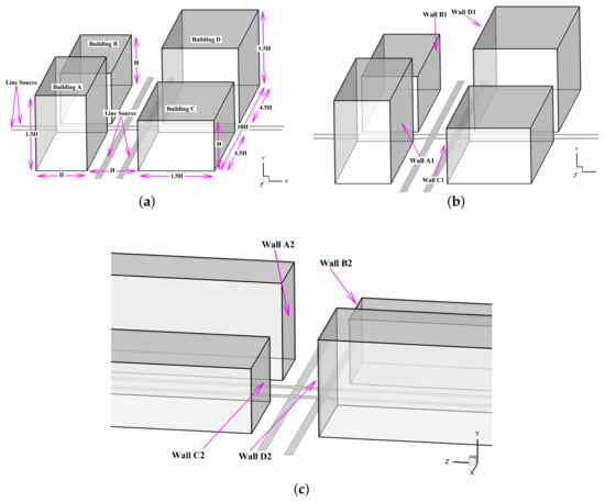 A model street canyon intersection: (a) building distribution, (b) walls 1, and (c) walls 2.