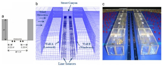 Illustrations on geometries and zones: (a) Outline of the locations of line sources inside the street canyon and the line sources presented for the (b) Computational Domain and (c) wind tunnel setup [,,,] ©CODASC, KIT, https://www.umweltaerodynamik.de/bilder-originale/CODA/CODASC.html (accessed on 20 June 2022).