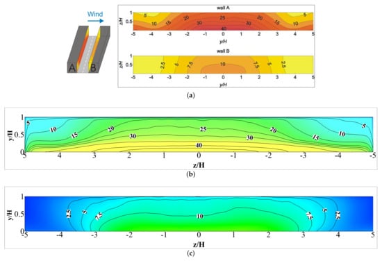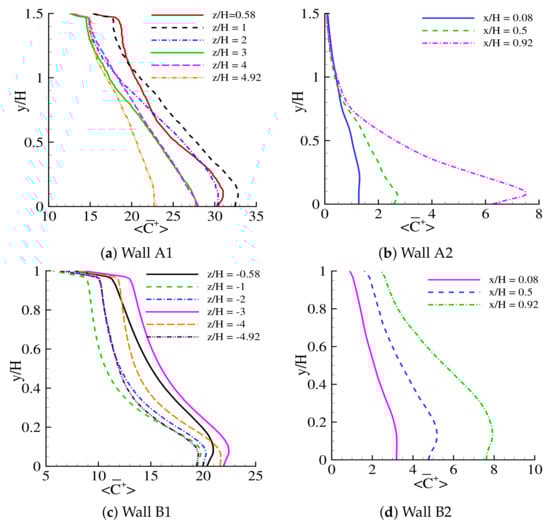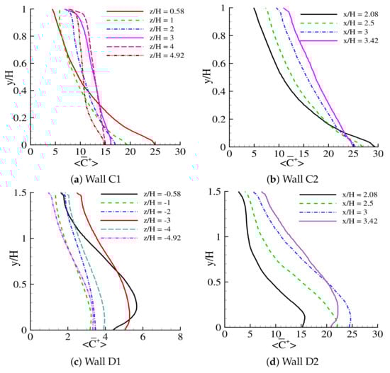 As previously described in Section 4.3, upwind Building A had a relatively higher height than the reference height (H). The elevated height causes a poor ventilation facility inside this canyon (i.e., the canyon between Buildings A and C), thus preventing big circulating vortices from developing in this area. Only small vortices were formed inside this canyon, which failed to disperse the traffic-exhaust pollutants effectively. These characteristics of the flow caused a high pollutant concentration on wall , as shown in Figure 13 (wall ), even though Building C was situated in the downwind side of the domain. Meanwhile, wall , also located at the downwind side of the domain, showed the lowest level of pollutant concentration, as shown in Figure 14 (wall ), compared to other perpendicular street canyon walls even though Building D had a height of , which is higher than the reference height of H. However, this elevation of building D did not prevent the incoming flow from effectively entering or exiting the street canyon (i.e., the canyon between Buildings A and C).