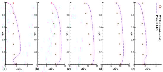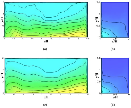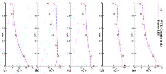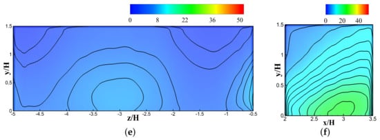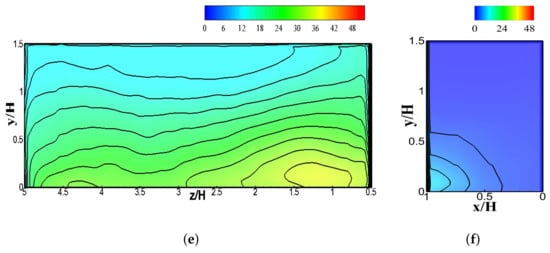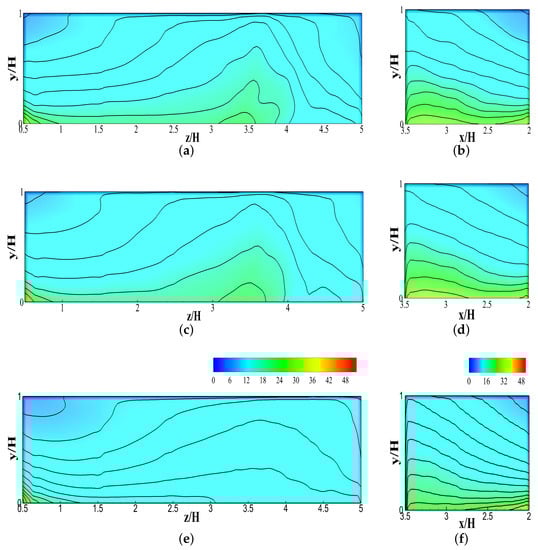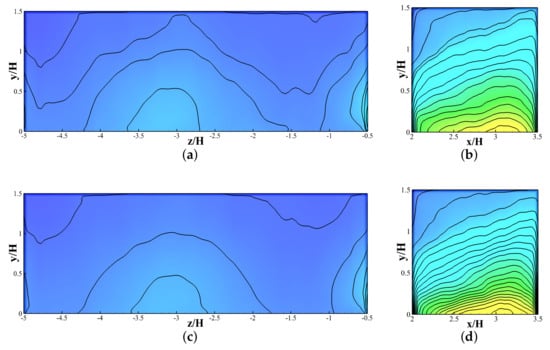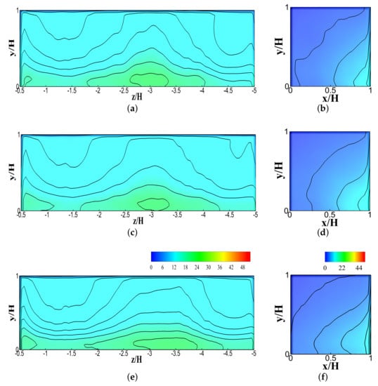 Figure 5 and Figure 6 graphically show the quantitative representation of pollutant concentration outlines at six various spanwise positions on both walls (, , , , ). These figures shows that LES is efficient and steady at projecting the pollutant concentrations at all positions along canyon walls. The WT database does not offer any flow field data. A past study by Salim et al. [] contained some flow-field and pollutant concentration data along the line within the street canyon. Salim et al. [] and several other studies confirmed that LES is the most reliable prediction tool for validating flow fields and turbulence structures in corresponding experiments [,,,]. It can be noticed from Figure 5 and Figure 6 that the LES prediction of pollutant concentrations at various points of spanwise locations is indeed good.