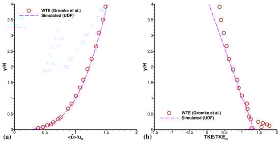 User-defined functions (UDFs) were executed in the ANSYS Fluent™ to maintain the WT experiment characteristics. The inlet air velocity profile follows the power-law profile of: