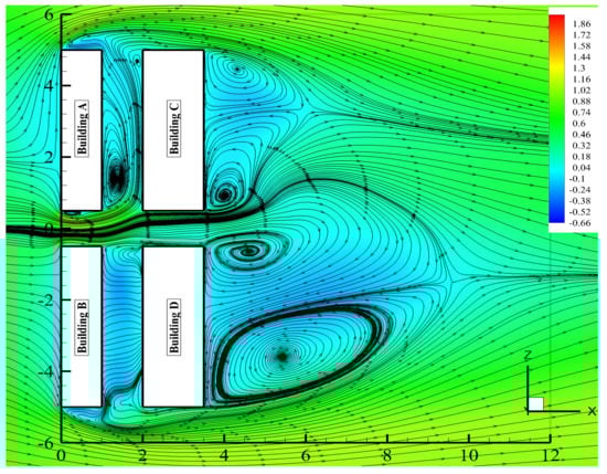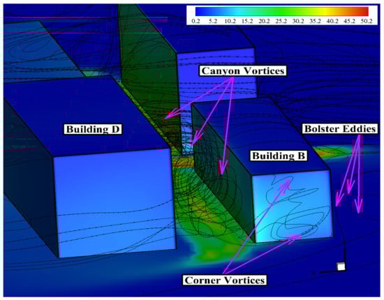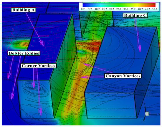 Pollutant concentrations on wall , also located at the upwind side of the building, were relatively lower compared to those on wall . The wind flow continuously entered and exited the street canyon (i.e., the street canyon between Buildings B and D) effectively, as seen from the streamlines of the velocity magnitude in Figure 15 and Figure 17, since Building B retains the standard reference height of H. Figure 15 and Figure 17 also confirmed the presence of a large circulating vortex inside the street canyon, which is the main factor for pollutant dispersion, along with a smaller vortex formation. The vertical flow velocity had a relatively higher magnitude inside the canyon as seen in Figure 17. The velocity magnitude and vertical velocity data justified the level of pollutant concentration shown in Figure 12 (wall ).