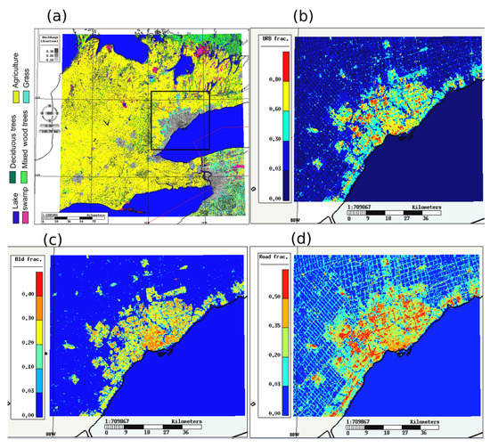 Surface description in TOR-GEM250. Dominant Land Use/Land Cover (LULC) and the limit of the refined region over GTA (black square) (a), with hereafter: urban fraction (b), building fraction (c), and road or pavement fraction (d). The Lake Ontario shoreline is in black.
