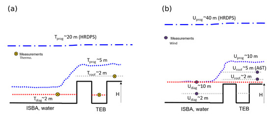 In order to evaluate model outputs near the surface, traditional diagnostic heights represented in the NWP systems are respectively about 2 m (10 m) above canopy level for the thermodynamic (wind) variables. A conceptual representation of the location of measurements and their corresponding modelled variables is presented in Figure 5.