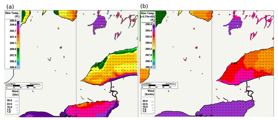 Comparison of water surface temperature (in K) and near-surface wind vectors (in knots) on 23 July 2015 0200 EDT (0600 UTC) over the inner domain between (a) TOR-GEM250 (with the PanAm downtown buoy located with the square and filled with the corresponding measured value), and (b) the 10-km operational analysis. Vectors are displayed based on the figure pixels and a mask covers the land surface for the sake of clarity).