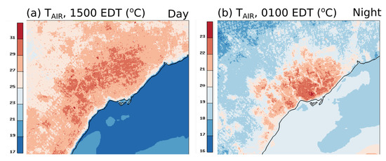 Impact of lake-breeze flows on GTA’s intra-urban CUHI is further investigated in the following paragraph. During the Games period (from 8 July to 15 August), 95% of the days featured lake-breeze development [15]. Figure 9 presents maps averaged for days with low deformation lake-breeze over the lake Ontario (10, 11, 27, 28 July and 15 August 2015). Low deformation lake breeze means that the influence of the synoptic-scale wind is low and that the lake breeze propagates inland parallel to the coastline [61]. Maps of air temperature are provided during daytime (1500 EDT) and night-time (0100 EDT). During daytime (Figure 9a), air temperature maximum values are found over the city but at about 10 km north of the shoreline. During nighttime (Figure 9b), maxima are found close to the shore and concentrated around Toronto downtown, due to the interaction of the land breeze with the persistent heat released in urban areas (release of energy stored during the day). These results are in agreement with the expected climatology for coastal city under lake-(or sea-) breeze regime (see Figure 2 in [1]). In those situations, the maximum CUHI over land reaches respectively 5 °C (7 °C) for daytime (nighttime), but with a strong anisotropy for daytime with almost 14 °C as compared to the water side.