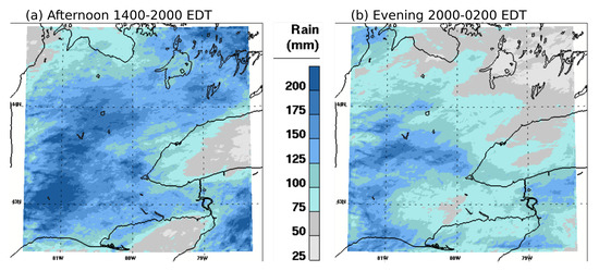 With seasonal averaging (from 13 May to 31 August 2015) similar to that in the previous Section 3.1.2, Figure 11 shows afternoon and evening 6 h accumulated precipitation amounts between 1400 and 2000 EDT (Figure 11a), and between 2000 and 0200 EDT (Figure 11b). In the afternoon (Figure 11a), larger values are found generally inland, at some distance from the lakes coasts. Maxima are found in the south-west region and in the centre of the land areas, with largest values in the region of the city of London, ON. Lower values are found over Toronto and north of it, with slightly more accumulation around the Oak Ridges Moraine outcrop north of Toronto. Minimum is found over the middle of the Great Lakes. These patterns can be explained by the prevalence of lake breezes inland and air mass advection towards slightly more elevated regions (Figure 3c).