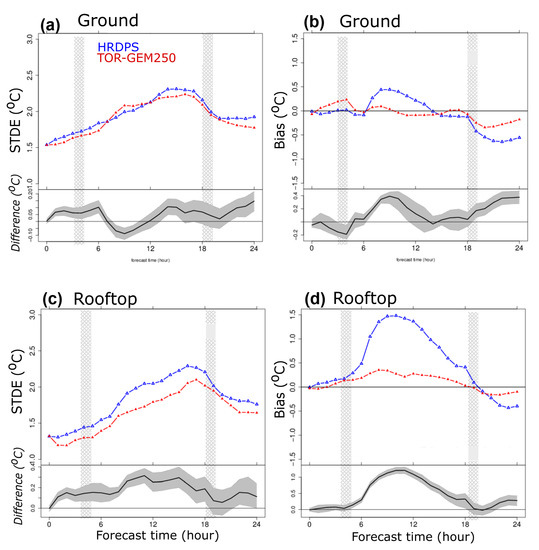 These features were implemented in the ECCC’s verification package presented in [20] to evaluate pan-Canadian short-range forecasts with the HRDPS. The tool performs several standard skill-scores and uncertainty is assessed with the bootstrapping method. In this study, Bias (BIAS) and standard deviation error (STDE) statistics are analysed for the prediction of near-surface temperature (T), dew point temperature (T), wind speed (U) and direction (U). Corresponding equations are reported in Appendix A.