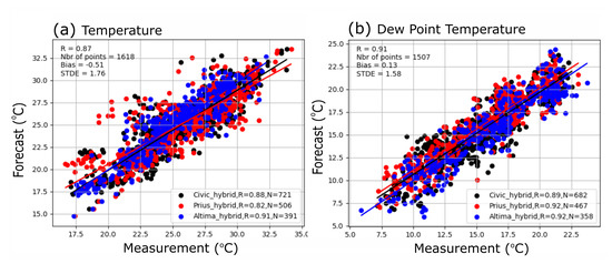 The second database is the ECCC Automated Mobile Meteorological Observation System (AMMOS, [15]) which provides near-surface meteorological data for 21 days (mostly daytime) during the summer of 2015 for three instrumented cars. Routes were large arterial roads but not highways, sampling the central part of GTA (Figure 4b, and see Section S1 of Supplementary Materials). They were following three parallel routes from the shoreline and the downtown to about 19 km north, sometimes up to 35 km at King City (at the location of ECCC’s radar), and more rarely, up to Lake Simcoe. A few itineraries were covering the area parallel to the Lake Ontario shore (at about 19 km away). Data used in this study are from quality-controlled meteorological data averaged at 1-min interval (original measurements were at 1-s interval). Temperature and dew-point temperature from AMMOS are compared with model values at the nearest grid points. Given the fact that there were four times fewer quality-controlled measurements for wind than for temperature and that more analyses would need to be performed, wind data are not retained in this study. In addition to bias and STDE, the linear correlation coefficient r is computed for the scatter plots evaluation of these data (Appendix A).
