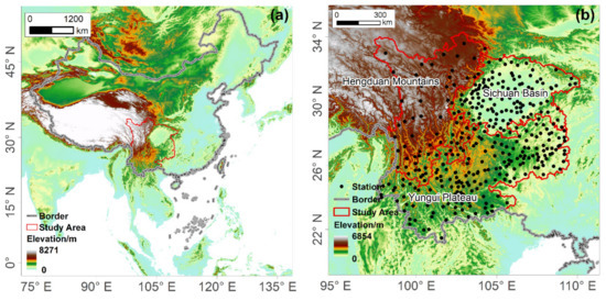 The study area covers the geographical region of 20°54′–34°19′ N, 97°21′–112°4′ E (Figure 1). It extends across the transition zone from the first ladder to the second ladder of terrain in China, with average elevation of 2906 m and a relative elevation difference of 6854 m. The terrain elevation difference is large, and the landform types are complex. From the southeast to the northwest, the region is affected by tropical monsoon, subtropical monsoon, and plateau monsoon climates. Under the alternating influence of these different monsoon climate types, heat and precipitation are abundant. Annual average temperature is between −2.8 and 23.9 °C, annual cumulative precipitation is 54.6–2675.6 mm, annual average relative humidity is 46.6–85.0%, and the annual cumulative number of sunshine hours is 844–2531 h. Owing to the complex terrain and the characteristics of the monsoon circulations, there is substantial spatial difference in terms of the impact of climate change. Therefore, the study area was divided into three subareas, i.e., the Hengduan Mountains (HDM), Yungui Plateau (YGP), and Sichuan Basin (SCB).