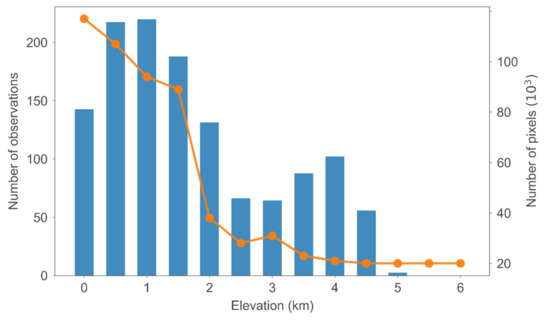 Number of observations and pixels in each elevation bin in Southwest China. The blue histogram denotes the number of observations, and the orange line denotes the number of pixels.