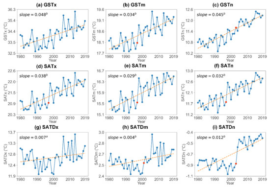 Annual averaged timeseries of (a–c) GST-, (d–f) SAT-, and (g–i) SATD-related indexes from 1980 to 2019 in Southwest China (a denotes significant at 0.05 level and b denotes significant at 0.01 level. Red dots denote climate jump. Slope denotes variation rate from 1980 to 2019).