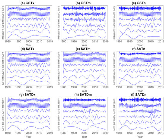 Decompositions of monthly averaged (a–c) GST-, (d–f) SAT-, and (g–i) SATD-related indexes from 1980 to 2019 into six timescales intrinsic mode function (IMF1–6) using the EEMD.