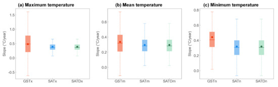 Box-and-whisker plots of trends in annual averaged GST-, SAT-, and SATD-related indexes from 1980–2019 in Southwest China (a) maximum temperature, (b) mean temperature, (c) minimum temperature (horizontal line represents median, and circle represents average).