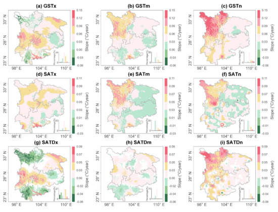 Significant variation rate of annual averaged (a–c) GST-, (d–f) SAT-, and (g–i) SATD-related indexes for each pixel from 1980 to 2019 in Southwest China. (Significance test by MMK trend method at the 0.05 confidence level). The different colors represent the variation rate and the histograms represent the significant (p ≤ 0.05) percentage of the classified pixel.