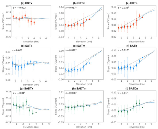 Variation rate of annual averaged (a–c) GST-, (d–f) SAT-, and (g–i) SATD-related indexes at each elevation bin in Southwest China from 1980 to 2019 (Box-and-whisker, where horizontal line and circle in box-and-whisker denote median and average, respectively, represents variation rate of observed meteorological stations at each elevation bin. Blue folded line represents mean variation rate of interpolated raster at each elevation bin. s denotes slope between annual variation rate of each index with elevation).