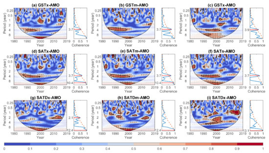 Wavelet transform and global coherence of anomaly of the monthly averaged (a–c) GST-, (d–f) SAT-, and (g–i) SATD-related indexes with the highest PASC large-scale index from 1980 to 2019 in Southwest China (Red dotted line in global coherence represents significant at 0.05 level).