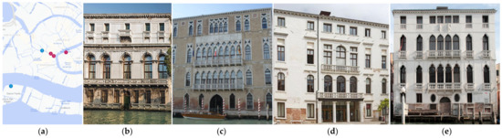(a) Geographical location of the case studies (red dots) and of Sacca Fisola (blue dot 1) and Rio Novo (blue dot 2) meteorological stations; (b) Ca’Dolfin façade; (c) Ca’ Foscari façade on Grand Canal; (d) Ca’ Foscari internal courtyard; (e) Garzoni Palace façade.