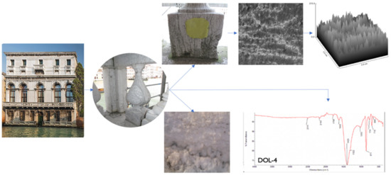 - Falchi, L.; Orio, E.; Balliana, E.; Izzo, F.C.; Zendri, E. Investigation on the Relationship between the Environment and Istria Stone Surfaces in Venice. Atmos. Environ. 2019, 210, 76–85. [Google Scholar] [CrossRef]