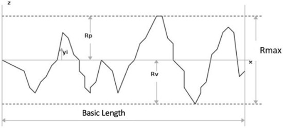 where Lr is the roughness estimate, Ra is the average roughness estimate (calculated by considering the areas between the actual profile and the mean line equivalent to rectangle with base, dx, and height, y), Rmax allows the estimation of the maximum irregularities present in a profile, and R2 is the value of data dispersion with respect to the trend line.