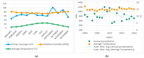 Arpav data elaboration: (a) monthly division for the 2000–2020 period of average precipitation (mm) in blue, average relative humidity (HR%) in orange, average temperature (°C) in green; (b) average annual precipitation and mean temperature from 2000 to 2020 with five year moving averages (dot lines).