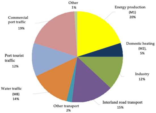 Figure 6 shows a graphical elaboration of APICE results [26], highlighting the prominent role of transport and industry as anthropogenic emissions source in Venice. It is the commercial and passenger port traffic that had the greatest impact in the last 20 years, especially due to emissions from cruise ships. Within the city center, the main source is constituted by locally produced emission from water traffic.