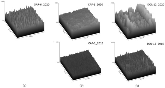 The morphological analysis of the surface allowed us to obtain information about the original structure of the stone. In Figure 7, the selected surface plot in the form of three-dimensional graphs is presented, while further graphs are reported in the Supplementary Material section (Table S1). The surface plots highlighted which areas the bush hammering or smooth finish of the stone were still conserved and not eroded. The surface plots of Garzoni Palace, regardless of location and exposure, appear to be quite homogeneous with each other. All the surface plots show a periodic pattern of ripples, with unevenness at small distances and very similar grey tones, which can be attributed to the surface processing by bush hammering. Going down from the third to the first floor in the Garzoni Palace, the graphs showed more homogeneous grey tones in each plot, pointing out the presence of smoother surfaces, with the loss of the original bush-hammered finish.