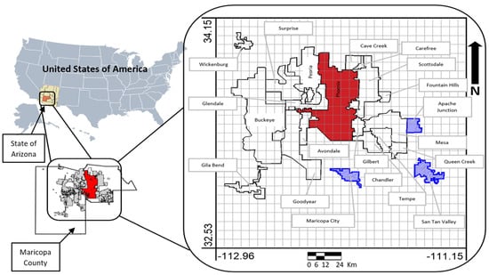We selected the city of Phoenix, Arizona, USA and the associated metropolitan area (Maricopa County) and three nearby cities from Pinal County (Maricopa City, San Tan Valley, and Apache Junction) for this study (Figure 1). The population of the city of Phoenix and Maricopa County based on 2020 census data were 1,608,139 and 4,420,568, respectively []. In addition, based on 2020 census data, the accumulated population of the other three sites was more than 165,000 []. Based on the Koppen climate classification, most of this area is located in the hot desert climate category (BWh), where the temperature can exceed 40 °C frequently [].