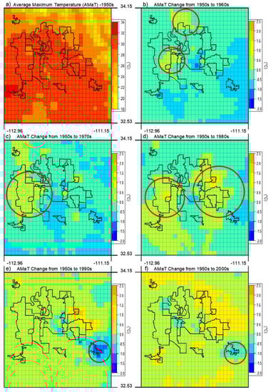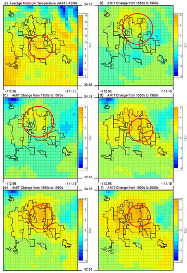 We analyzed the decadal average minimum temperature (hereafter AMiT) and decadal average maximum temperature (hereafter AMaT) for the study domain from 1950 to 2009. As shown in Figure 2a, AMiT ranges from 0 °C to 18 °C in the 1950s, with higher temperatures in the southern part of the city of Phoenix (red circle on Figure 2a) and southwest of the study domain and lower temperatures in the northeast part of the domain. Higher AMiT in the 1950s in southern Phoenix can be attributed to the urban heat island effect []. During the 1960s and 1970s, AMiT increased in the urbanized areas to the north (red circles on Figure 2b,c), while it decreased in the southern domain of the delineated municipal areas. For the next three decades, AMiT increased steadily, particularly in the urbanized areas. By the 2000s, the decadal average nighttime temperatures for the city of Phoenix had increased by up to 6 °C.