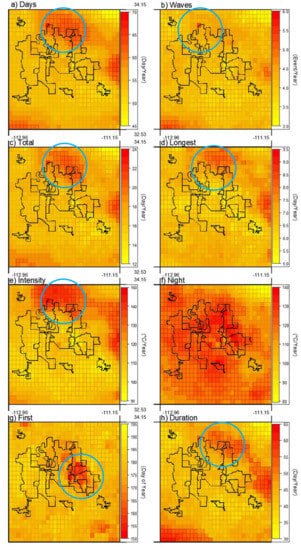 We found that the average temperature in the greater Phoenix area has increased over the last six decades, extending the results from prior studies [,,], with marked increase in minimum nighttime temperature. We attribute this change to global warming and urbanization and knock-on effects from UHI to the greater nighttime temperature []. However, disaggregation and quantification of the individual contributions of climate change and urbanization to increasing temperatures is not within the scope of this research. We observed clear and quantifiable spatial variations in heat wave components across the study area. To the best of our knowledge, this is the first research study that shows the spatial and temporal changes in various heat wave components simultaneously. This finding calls into question the fidelity of current heat wave risk mapping and classification methods. In addition, it echoes a need for more regional and finer scale extreme events studies, particularly for heat waves [,].