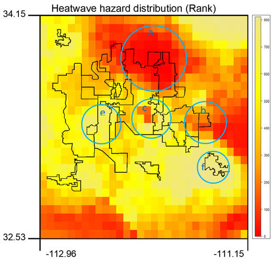 We applied the TOPSIS multi-criteria decision-making model to sort the domain pixels according to the eight defined heat wave components, following the steps described in Section 2.4. The base hazard classification scenario (S1) weighted each heat wave component equally. The pixel rank values indicate the level of heat wave hazard in decreasing rank order (1 to 810) within the map. Figure 5 shows five main regions of greater heat wave hazard, of which only three are in the urbanized area. The first region includes northern Peoria and Phoenix, Cave Creek, Carefree, and most of Scottsdale (Figure 5, Circle a). Similarly, the eastern part of Mesa and all of Apache Junction have higher heat wave hazard (Figure 5, Circle b). This greater hazard follows the spatial distribution of Days, Total, Intensity, First, and Duration shown in Section 3.2 (Figure 4a,c,e,g,h). Surprisingly, we found localized heat wave hazard in southern Phoenix (Figure 5, Circle c). This area did not show high individual heat wave components but scored a greater hazard from multiple contributing hazard elements. Overall, heat wave hazard is extensive north of Surprise and Buckeye, least in Goodyear and Southern Buckeye (Figure 5, Circle e), and San Tan Valley (Figure 5, Circle f).