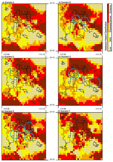 The importance of the weighing of hot days, heat wave frequency, total duration of heat waves, and longest heat wave events for each year are shown by comparison of scenario S1 with S4, S5, and S6. S4 decreases heat wave hazard for the eastern regions, while increasing heat wave hazard from mild to moderate for the cities of Surprise and Buckeye (circles shown on Figure 6d). S5 represents both daytime and nighttime heat wave intensities and heat wave onset time, which have the greatest weight of the eight heat wave components (Table 1). Previous qualitative studies have prioritized these criteria due to the direct effects on human health [,,]. Based on S5, heat wave hazard decreases from moderate to mild for the western part of Buckeye, increases from moderate to severe in southern Surprise, increases from severe to extreme for northern Phoenix, and increases from moderate to severe for the southern part of Phoenix. Following other scenarios, we find no significant change in heat wave hazard classification for cities out of Maricopa County. Similarly, the heavy weighting factor (4) of S6 for heat wave intensity during days and nights and heat wave onset further emphasizes heat wave hazard in urban areas by increasing heat wave hazard level. In this scenario, we observed a change from moderate to mild hazard for the western part of Buckeye, from moderate to severe and extreme in southern Surprise, from severe to extreme for the northern part of Phoenix, and from moderate to severe and extreme for the southern part of Phoenix.