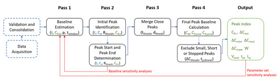 The algorithm used seven primary parameters: three parameters (p, twindow, Rthresh) determine baselines and peaks in Passes 1 and 2, and four additional parameters (tthresh, dthresh, tp,thresh, ΔCthresh) merge adjacent peaks and filter out potentially false peaks in Passes 3 and 4. We evaluated these parameters in sensitivity analyses that systematically changed parameter values while recording the number of peaks reported, flagged by predetermined criteria (described below), merged, or filtered out. Additional parameters (Pass 1 baseline skip gap, set as 30 s; Pass 4 filtration criteria due to vehicle stop, set as 50% of measurements; and Pass 4 vehicle stationary speed limit, set as 0.05 m/s) generally had much smaller effects on results. The sensitivity analysis was performed using data subset 1. The selected parameters were then applied to data subset 2.