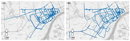Maps showing driving routes for data subsets 1 (A) and 2 (B). Maps represent a 11 × 17 km region. Often, repeated passes were made both within and among the days in the 10-day data subsets. Solid circles represent periods when the vehicle was parked for an extended period (typically more than 0.5 min).