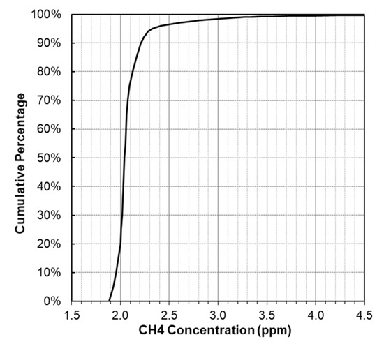 Cumulative probability plot of 1-s CH4 measurements in data subset 1.
