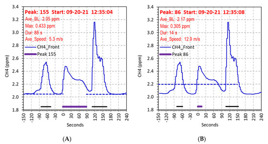 Table 3 summarizes statistics of the 280 CH4 peaks detected using our algorithm with parameter set 4 and data subset 1. For these peaks, the average and the median ΔCmax were 1.02 and 0.28 ppm, respectively; the largest ΔCmax was 23 ppm. Most peaks were much smaller, e.g., 75% of the peaks had ΔCmax < 1 ppm, and only 2% of peaks had ΔCmax > 7 ppm. This analysis used 1-s data, which helps to detect small and highly localized peaks. The use of longer averaging periods (e.g., 2 s or 5 s) can reduce random noise, however, narrow peaks can flatten significantly, and some small peaks may be lost. Moreover, an averaging period of even a few seconds while driving at typical urban speeds (e.g., 11.2 m/s or 25 mph) represents a relatively large distance that does not permit accurate localization, thus slow speeds may be preferred in some applications.