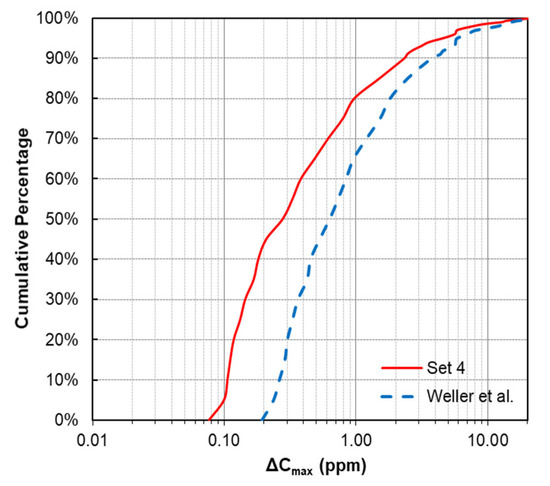 The cumulative percentage and scatter plots (Figure 5 and Figure 6) illustrate further differences, but they tend to confirm the trends noted above. Our algorithm with parameter set 4 more effectively detects small peaks, e.g., 50 and 80% of detected peaks had ΔCmax < 0.3 ppm and 1 ppm, respectively, while the Weller et al. percentages dropped to 20% and 65%. Nearly all peaks (145 of the 166) detected by the Weller et al. algorithm were matched with our algorithm, and the scatter plots showed a strong correlation for ΔCmax (r2 = 1.00). The ΔCmax reported by Weller et al. was slightly smaller (0.04 ppm (Figure 6A)). The correlation for CB was relatively high (r2 = 0.87), but the Weller et al. CB was generally 1.2 times larger (Figure 6B). Five peaks were “outliers” that fell off the linear trend line; these were caused by baseline overestimation with p = 0.5. The correlation for tp was moderate (r2 = 0.55) and the fitted line had a slope of 0.47 (Figure 6C), a result of the larger Rthresh (1.1) used by Weller et al. that yielded shorter peaks (usually 25–80% of the duration of those detected with parameter set 4).