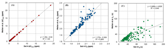 Scatter plots comparing results of parameter set 4 with Weller et al.’s method [21] for (A) peak maximum concentration, (B) peak baseline concentration, and (C) peak duration.