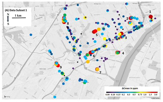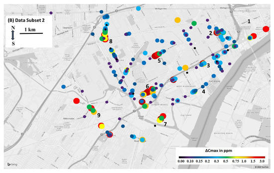 Overall, data subset 2 yielded results that were very similar to those discussed earlier (Table 2 and Table S1). This includes the number of peaks identified (348 and 254 peaks after Passes 2 and 4, respectively), the range of the daily baseline (1.93–2.17 ppm), and statistics for ΔCave, ΔCmax, and ΔCmed. For the highest 2% of peaks, ΔCmax difference between data subset 1 and 2 ranged from 2.9 to 8.2 ppm, and most larger peaks (ΔCmax > 1 ppm) were detected at the locations seen earlier (Figure 7A,B), including locations 2 and 5–9. While ΔCmax at some of these locations varied from levels seen earlier, this can result from factors noted above, e.g., leak repair. Many smaller peaks (ΔCmax < 0.5 ppm) were repeatedly detected at or near locations found for dataset 1. The most notable differences occurred near locations 1, 3, and 4: the large peaks previously detected at location 1 were not present in the second dataset (but two one-time and large peaks appeared just to the south); and the cluster of peaks around locations 3 and 4 (near the bridge construction) were reduced to two large peaks at location 3 and none at location 4, although a series of small peaks were found elsewhere around the construction site. These differences may reflect changes in construction activity, leak repairs, and the other factors discussed earlier. Overall, the two datasets yielded very comparable results, suggesting that the CH4 survey and the algorithm led to reproducible and reliable results.