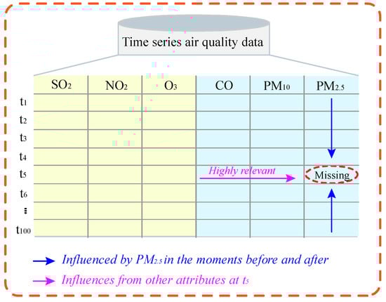 Air pollutants pose significant threats to public health, especially the toxicity and diseases caused by atmospheric fine particulate matter [1]. According to a survey, air pollution kills approximately 4.2 million people every year [2]. Therefore, air quality is still an issue of concern in recent years. Environmental researchers mine air quality data to uncover potential value and information, which captures user behavior [3], estimates influenza diseases [4], explores greenhouse gas emissions [5], investigates personal actions to reduce greenhouse gas emissions [6], and so on, to advise the related policy makers. However, due to problems of instrument malfunction, communication noise, and/or other unknown reasons [7], data are frequently missing. Moreover, although most air quality monitoring data are time series data, processing extensive time series environmental data with missing values is usually laborious and difficult, and sometimes unexpected failures are not detected until data are processed. Consequently, environmental databases frequently have some gaps caused by missing data [8]. It is the gap that not only seriously affects the accuracy and availability of data, but also affects the subsequent work of in-depth analysis and data mining [9]. Therefore, it is worthwhile to understand the types of data with missing values and propose an effective and robust strategy to fill time series air quality data with missing values.