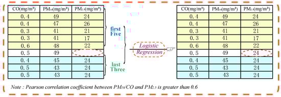 Figure 3 illustrates the process of the imputation approach for a data point with missing values in more detail. We present only the attributes that are highly correlated with PM2.5 in this figure, including CO and PM10. In Figure 3, the missing value for the concentration of PM2.5 is finally filled with “24”. First of all, by detecting the data point with a missing value and accessing its Pearson correlation coefficient, we can discovery the corresponding “first Five” and “last Three” of the data point, which are represented on the brownish-yellow background and blue-green background colors in the figure, respectively. Next, the “first Five” and the “last Three” are employed to train a model by logistic regression, and this model is applied to obtain the missing concentration values of PM2.5 last; then, “24” is obtained.