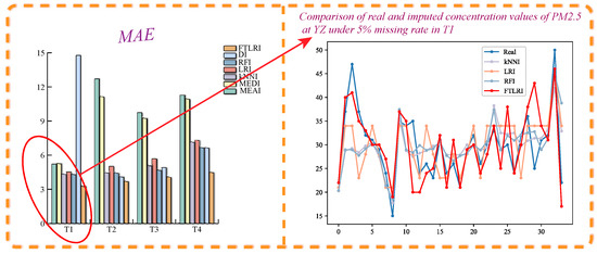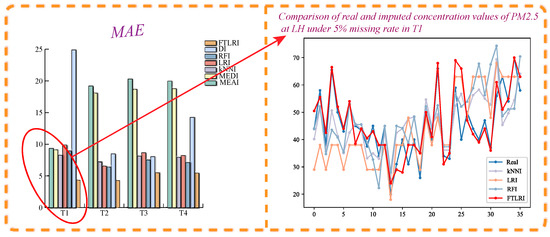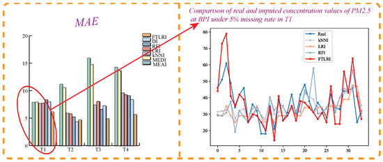 Figure 6 clearly depicts a specific imputation effect diagram of PM2.5 with a missing rate of 5% as an example at BPI. The bar chart on the left provides the diagram of the MAE obtained after PM2.5 was imputed, while the line chart on the right takes short-term time series T1 as an example to describe the values of PM2.5 imputed by the four relatively superior imputation methods and the corresponding real values of PM2.5. As can be seen from Figure 6, the proposed method FTLRI almost achieves better performance than the other six imputation methods at BPI on the whole.