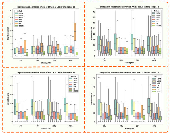 Aiming at more intuitively comparing the imputation performance of FTLRI with the other five classical imputation approaches and the new dynamic imputation method using a neural network, Figure 7 shows the imputation errors of PM2.5 at LH in different time series under different missing rates. The imputation errors are expressed as the absolute values of the results calculated by subtracting the values imputed by different methods from the corresponding real value of PM2.5. The smaller the absolute value is, the smaller the error is, and the better the corresponding imputation methods are. The horizontal coordinate of each subplot indicates the various missing rates, and the vertical coordinate indicates the imputation errors, while the colors represent the corresponding imputation methods. As can be seen from Figure 7, the errors of FTLRI were smaller than that of the other methods, and the median lines of the box plot of FTLRI were also lower than that of the other five classical imputation methods and the new dynamic imputation method using a neural network, which further indicates that FTLRI has an advantage in missing data imputation compared with the other methods under different missing rates in both short-term and long-term time series.