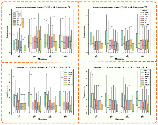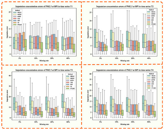The implementation of the imputation experiment was carried out according to the Pearson correlation coefficients obtained in Table 3. We selected pollutants whose Pearson correlation coefficient with PM2.5 was greater than or equal to 0.6 to fill the missing concentration values of PM2.5 in Table 3. Specifically, at LH, the concentration values of PM10 were employed to fill the missing concentration values of PM2.5 through different imputation methods in time series T1 and T2, and the concentration values of CO and PM10 were employed to fill the missing concentration values of PM2.5 through different imputation methods in time series T3 and T4. At YZ, the concentration values of PM10 were employed to fill the missing concentration values of PM2.5 through different imputation methods in time series T1, T2, and T4, and the concentration values of SO2, NO2, CO, and PM10 were employed to fill the missing concentration values of PM2.5 through different imputation methods in time series T3. At BPI, the concentration values of PM10 were employed to fill the missing concentration values of PM2.5 through different imputation methods in time series T1, T2, and T4, and the concentration values of SO2, NO2, CO, and PM10 were employed to fill the missing concentration values of PM2.5 through different imputation methods in time series T3.