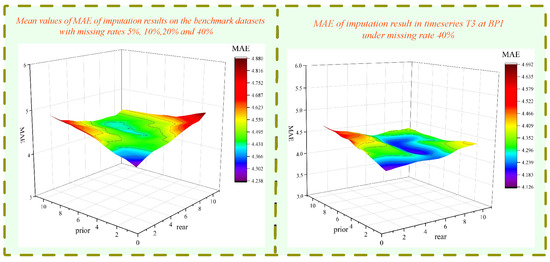 By setting prior and rear from 1 to 10, respectively, to reduce time consumption, we evaluated the corresponding MAE on the benchmark datasets with different missing rates. Figure 10 illustrates the mean values of the MAE of imputation results for all the datasets under different missing rates, and the MAE of imputation results in T3 under a missing rate of 40% at BPI. The stable experimental results in Figure 10 prove that FTLRI is insensitive to prior and rear and indicate that FTLRI is a robust imputation method. Selecting the first five and the last three as a common rule of thumb basically achieved superior imputation performance. In a real application, to access a relatively desired performance, we suggest setting prior and rear from 1 to 10.
