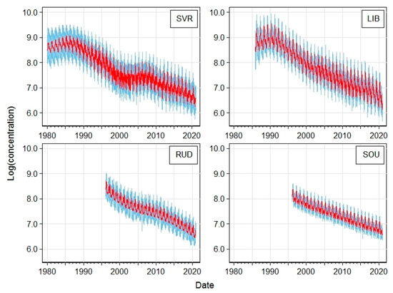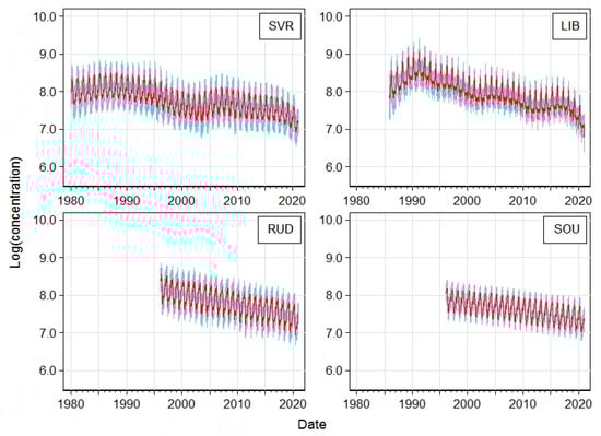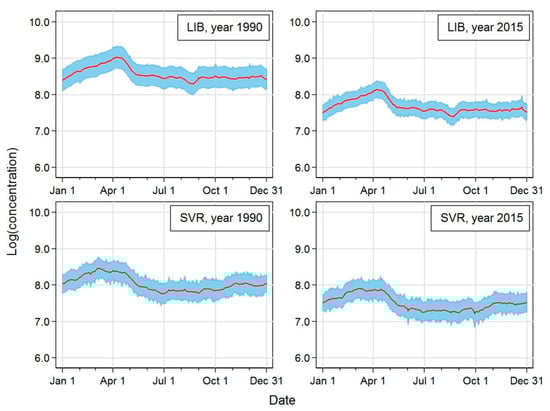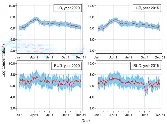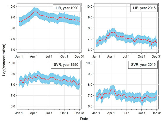 - is the Tx1 vector of linear predictors from model (1) for the T days covering the time interval of interest between the start of the first (I = 1) sample and end of the last (I = n) sample available in the data. arises as a sum of overall mean vector (). is an annual component (Tx1 vector of from model (1) evaluated at T days’ stretch of interval of interest), is a seasonal component (Tx1 vector of from model (1) evaluated at T days of interval of interest) and is an interaction component (Tx1 vector of from model (1) evaluated at T days of interval of interest).