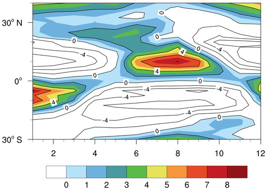 Latitude–time cross-section of 850 hPa zonal wind (2011–2020) mean along 110°–120° E. The shaded area denotes positive zonal winds (unit: m s−1). The x-axis represents months from January to December.
