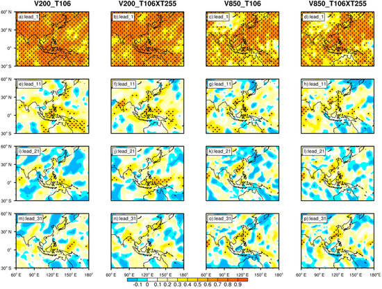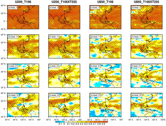 The TCC distribution (shading) of 200 hPa and 850 hPa zonal wind field between prediction results (T106 and T106 × T255) and reanalysis for different lead times. The values exceeding 95% confidence level according to Student’s t-test are dotted. (a,e,i,m): 200 hPa zonal wind in T106; (b,f,j,n): 200 hPa zonal wind in T106 × T255; (c,g,k,o): 850 hPa zonal wind in T106; and (d,h,l,p): 850 hPa zonal wind in T106 × T255.
