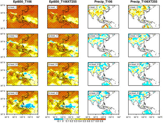 The overall prediction capability for θse is reasonable (Figure 4a–h), and the two prediction results are almost consistent. Within the lead time of 11 days, the TCC of most regions is higher than 0.6 and passes the significant test at the confidence level of 95%. The weak prediction capability is mainly restrained in the Philippine Islands and the area to the east. However, the area with weak prediction capability of T106 × T255 is slightly smaller than that of T106. Another prominent feature of the SCSSM onset is the remarkable seasonal enhancement in precipitation intensity [4]. Therefore, the model prediction of precipitation is investigated (Figure 4i–p). The prediction ability for precipitation is conspicuously weaker than the zonal wind and θse, and in some regions, a negative correlation even exists. From Equation (1), θse is closely related to T and q, which are hereafter discussed (Figures S5–S8). The distributions of TCC in T and θse are similar, which indicates that the prediction results of θse may depend primarily on T. At the same time, the weaker prediction ability for q could constrain the prediction of θse, which may further restrict the model’s prediction of SCSSM onset.