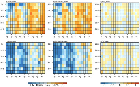 The pattern correlation coefficients between reanalysis and model predictions of (a,d) T106 and (b,e) T106 × T255 for (a–c) zonal wind and (d–f) meridional wind at 850 hPa over the SCSSM region (20° S–30° N, 60°–150° E) for 2011–2020 (y-axis) from the 21st pentad to the 38th pentad (x-axis) for lead times of 1–31 days. The differences in pattern correlation coefficients in the two models are presented in (c,f).